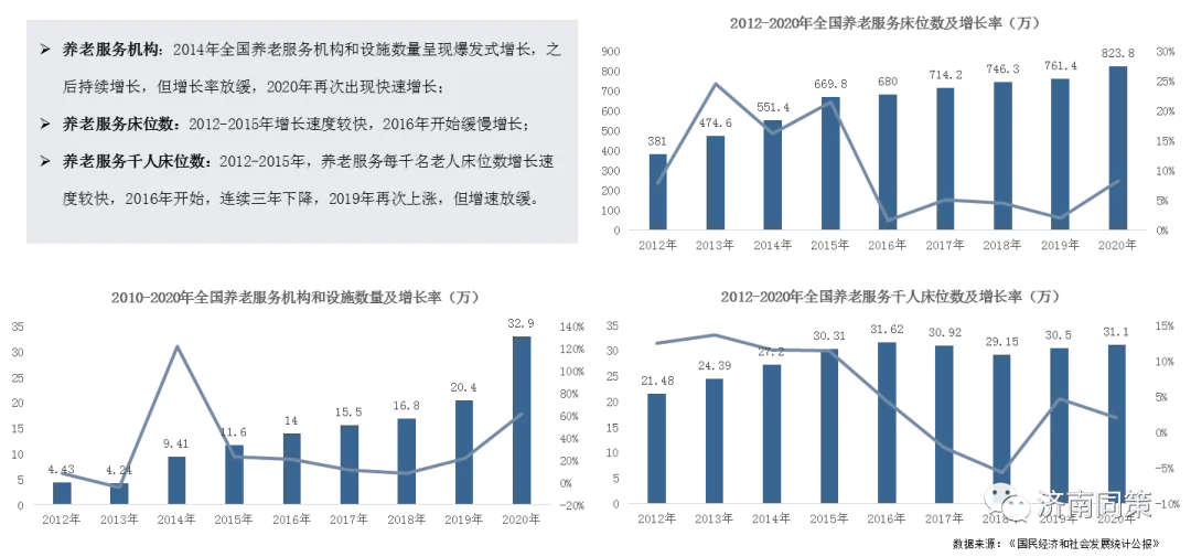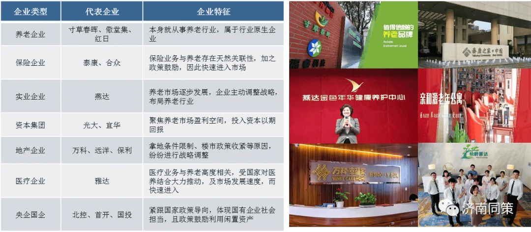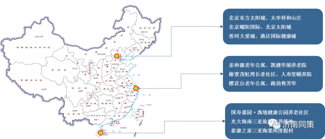 3、保险业+养老,是指老年人通过购买指定种类及金额的保险产品即可获得养老社区入住资格的模式,一般面向高净值客户。保险公司利用其规模大、周期长的保险资金来投入到自营的养老社区,与前端的保险销售形成完整养老闭环,重资产布局养老地产,轻资产覆盖养老运营。
