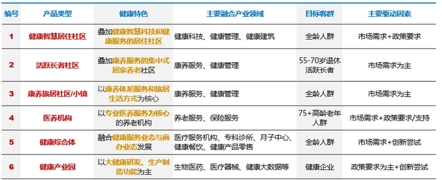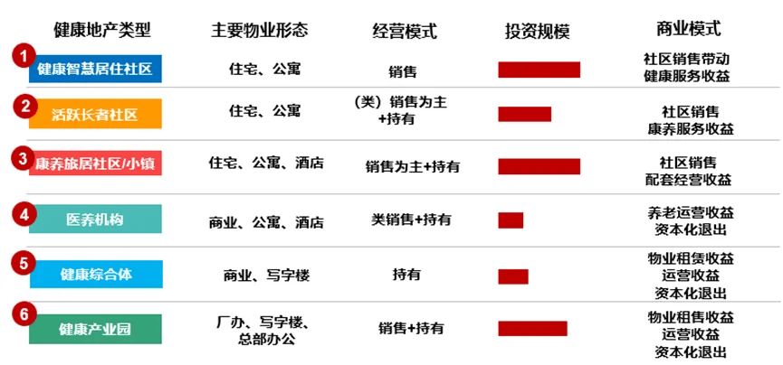 健康智慧社区/活跃长者社区/康养旅居社区,主要为住宅形式,配置健康智能设施或养老服务、健康管理等配套;医养机构/医养综合体一般在城市核心区的写字楼等商办物业中,由专业的运营机构运营;而健康产业园主要为园区形式的生产研发型物业。