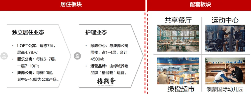 项目为商业用地性质,总建面13万㎡,容积率1.8,分为居住和配套两大板块。居住板块有独立居住和护理两种业态产品,以平层公寓和loft公寓形态呈现;配套板块包含餐厅、运动、生活、教育等功能,为长者提供产权住宅+医养服务+文化生活+多代同堂+亲友相聚的优质混龄居住社区。项目通过打造活跃长者社区实现销售价格与周边住宅持平。