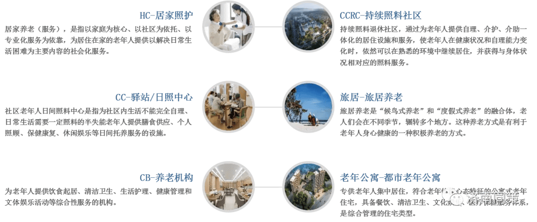 医养机构一般布局在市区及近郊区,主要分为聚焦活力老人的大型持续生活社区(CCRC)、面向独立老人的大型老年社区、面向活力老人以外的照护型老年公寓(CB)及服务或协助失智/照护型老人的小型嵌入式照护中心(CC)。