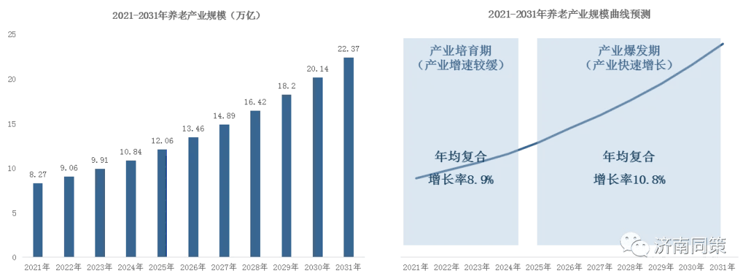 2024年养老产业规模达到10万亿元,预计2025与2030年将分别突破12万亿元和20万亿元;2020-2024年养老产业规模复合增长率为8.9%,而2025-2030年养老产业复合增长率为10.8%,意味着未来五年养老产业将提前完成产业孵化,转而迈入产业爆发期。