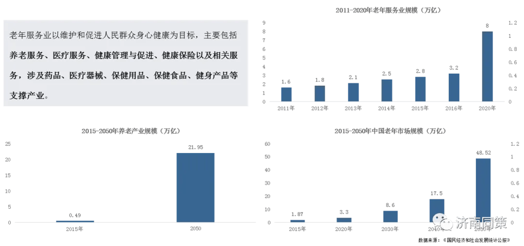 预计至2050年,老年市场和养老产业分别以9.74%和11.48%的年增长率高速发展,养老产业发展潜力巨大,发展空间广阔、增速快、多元化。